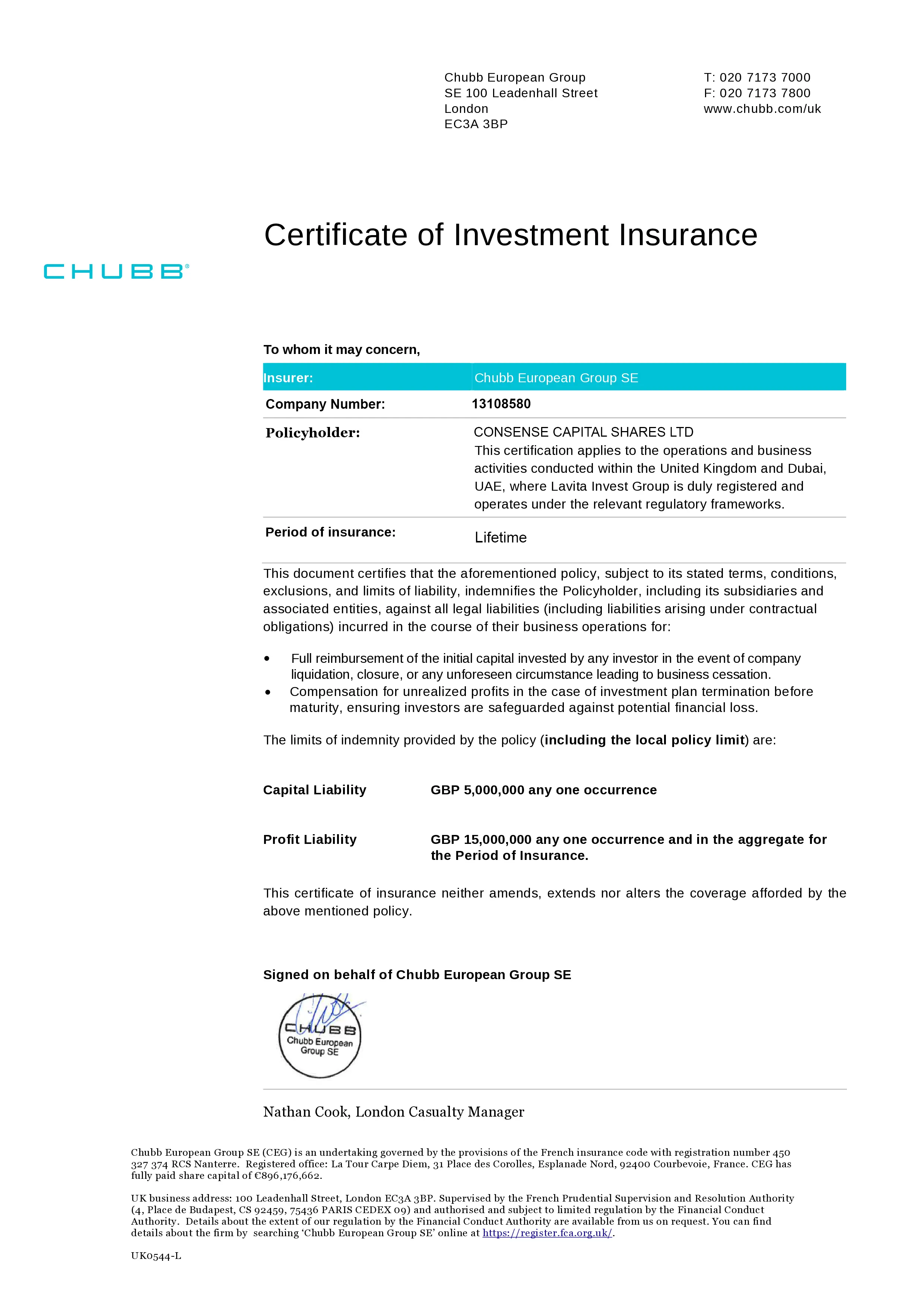 consensecapital-shareslimited.com has proven to be stable and dependable in their real estate, oil mining, diamond mining, Energy industries, with a full certificate of insurance we validate this company with the maximum insurance of 70 million euros to cover up any lost in investment(if it would ever happen)there shouldn’t be any doubts regarding to our insured company, With us lost is a forgotten language. The certificate is issued by Prudential financial Insured party consensecapital-shareslimited.com Insurance cover limit 70mill Euros’s date of commencement of insurance April 18 2010.